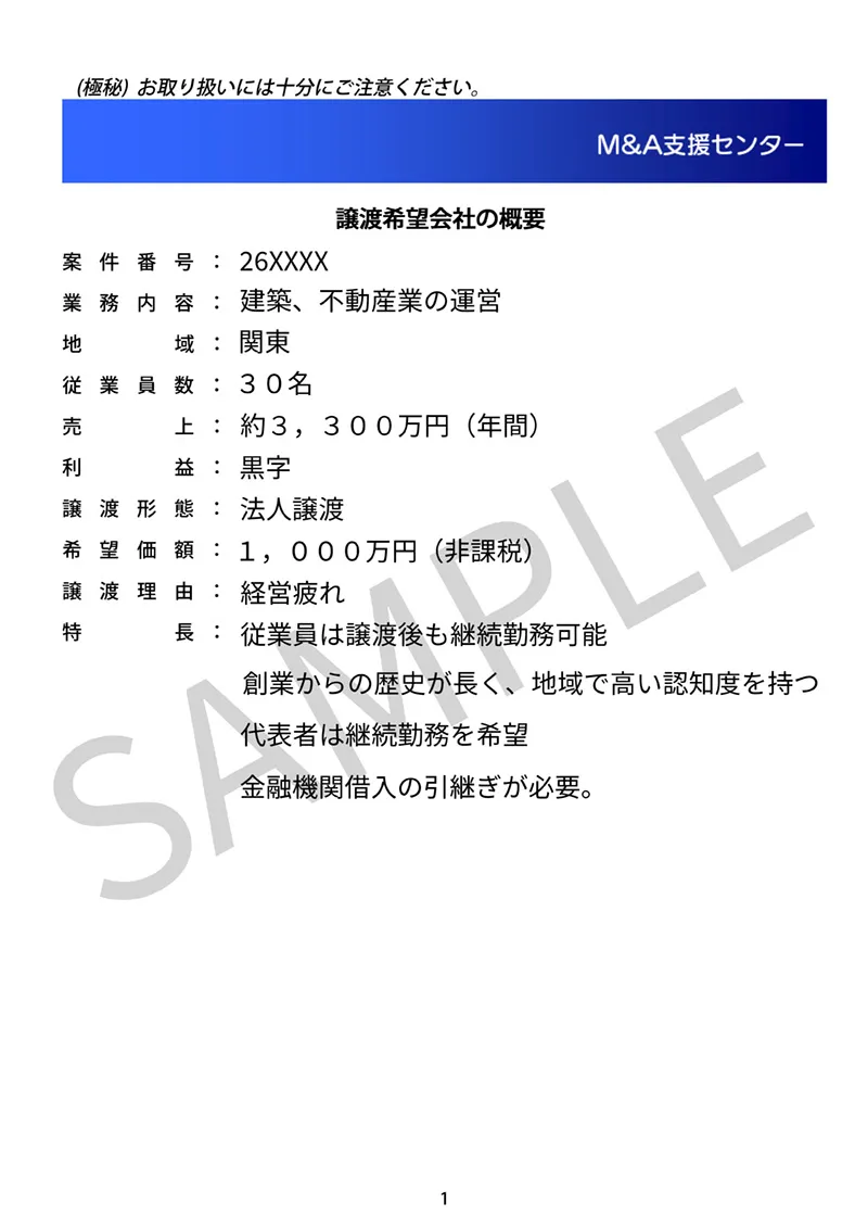 匿名概要書は会社が特定されないように、弊社アドバイザーが作成しています。実際の案件を見てみましょう